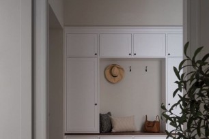 白色玄關(guān)柜以美式線板裝飾連接到同平面上的電視柜,打造整體收納墻;