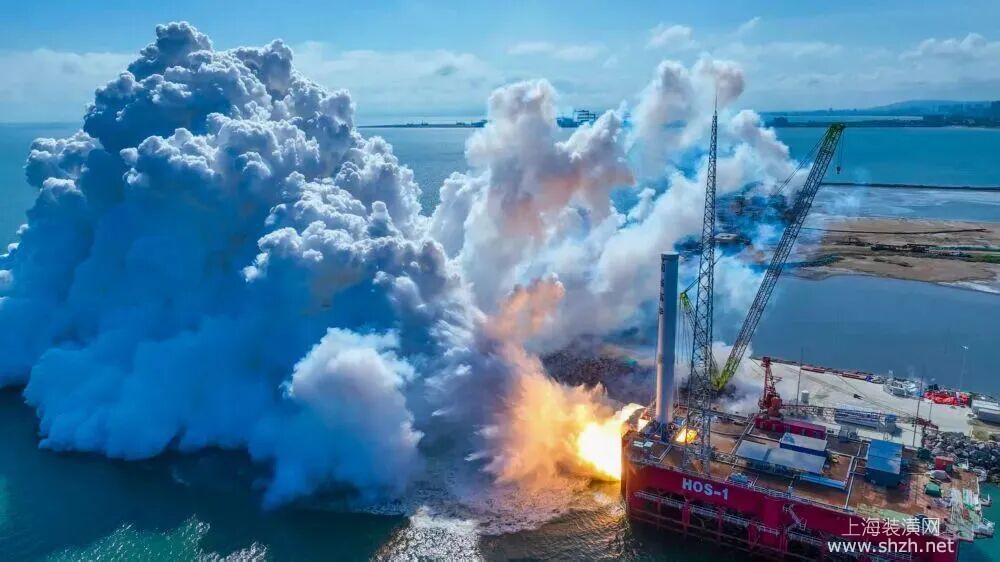 2025年9月15日,天龍三號(hào)液體運(yùn)載火箭在山東海陽(yáng)東方航天港海上平臺(tái)進(jìn)行一級(jí)動(dòng)力系統(tǒng)試車(無(wú)人機(jī)照片)。新華社發(fā)