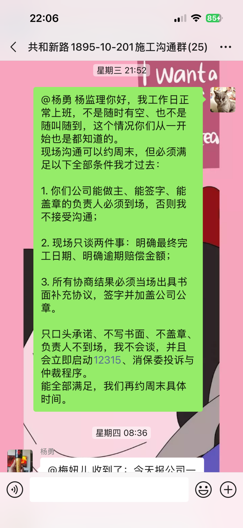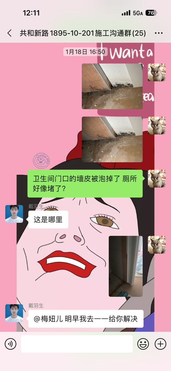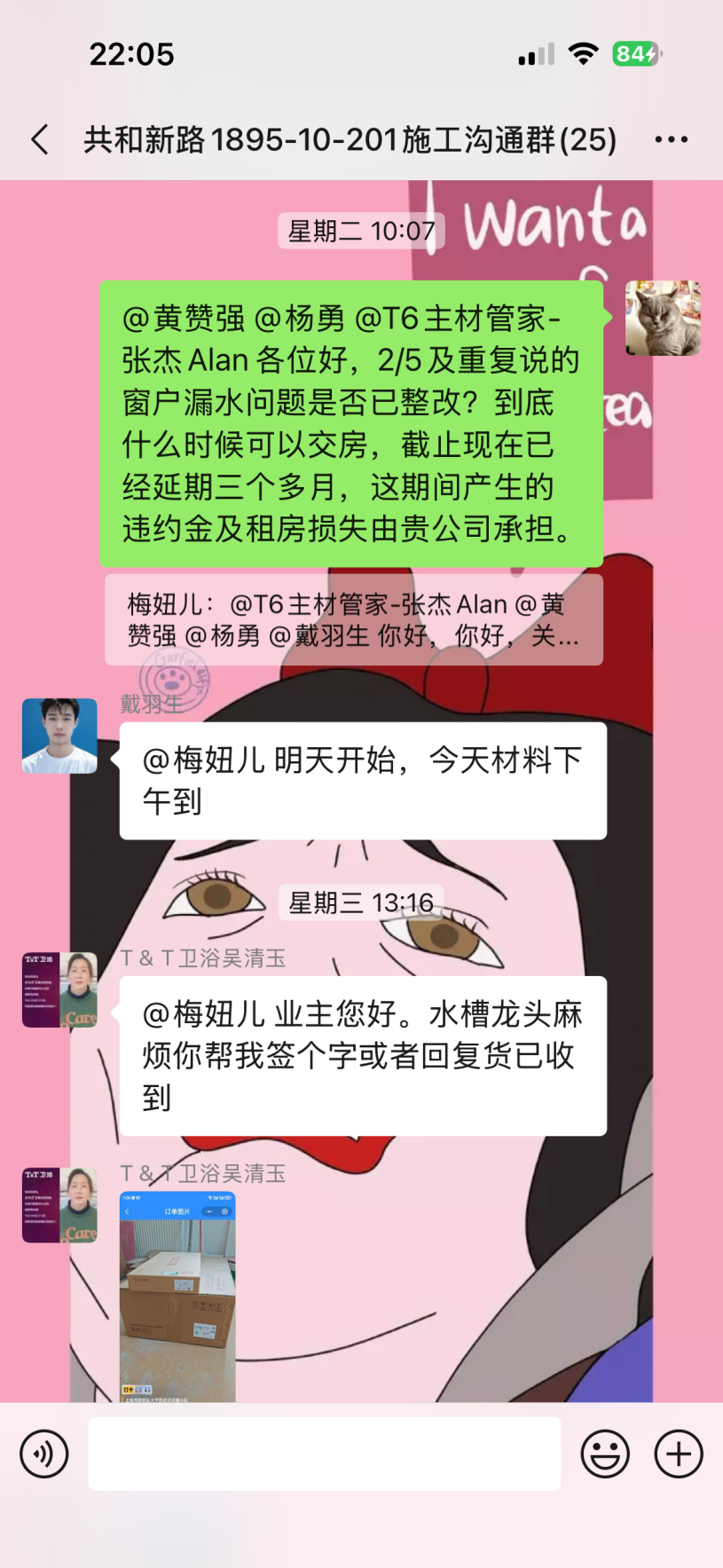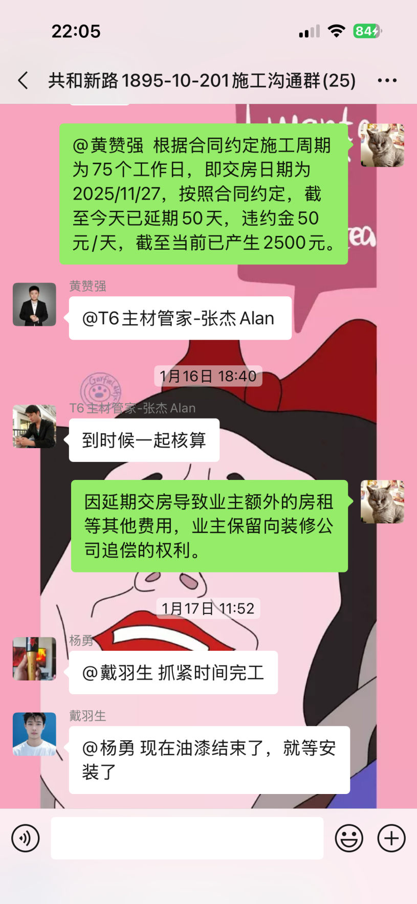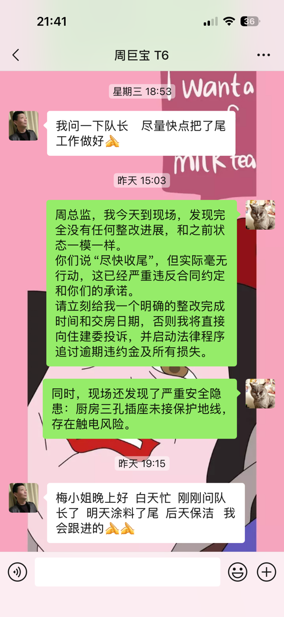 截至目前仍未完工,主材備貨也未按合同執(zhí)行,已嚴重逾期。本人多次發(fā)催告函、在工作群溝通,對方拒不聯(lián)系、拒不協(xié)商,持續(xù)消極違約。同時施工過程中,該公司違規(guī)操作將樓上樓板打穿,雖已修復(fù),但過程中推諉責(zé)任,且修復(fù)時間嚴重逾期。