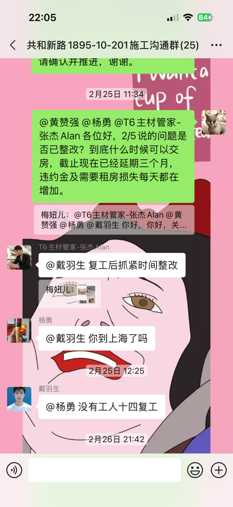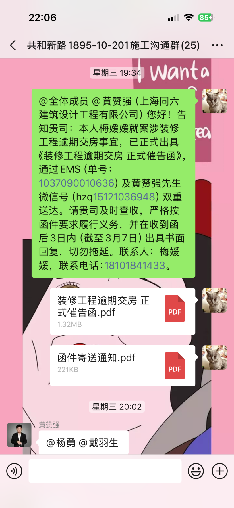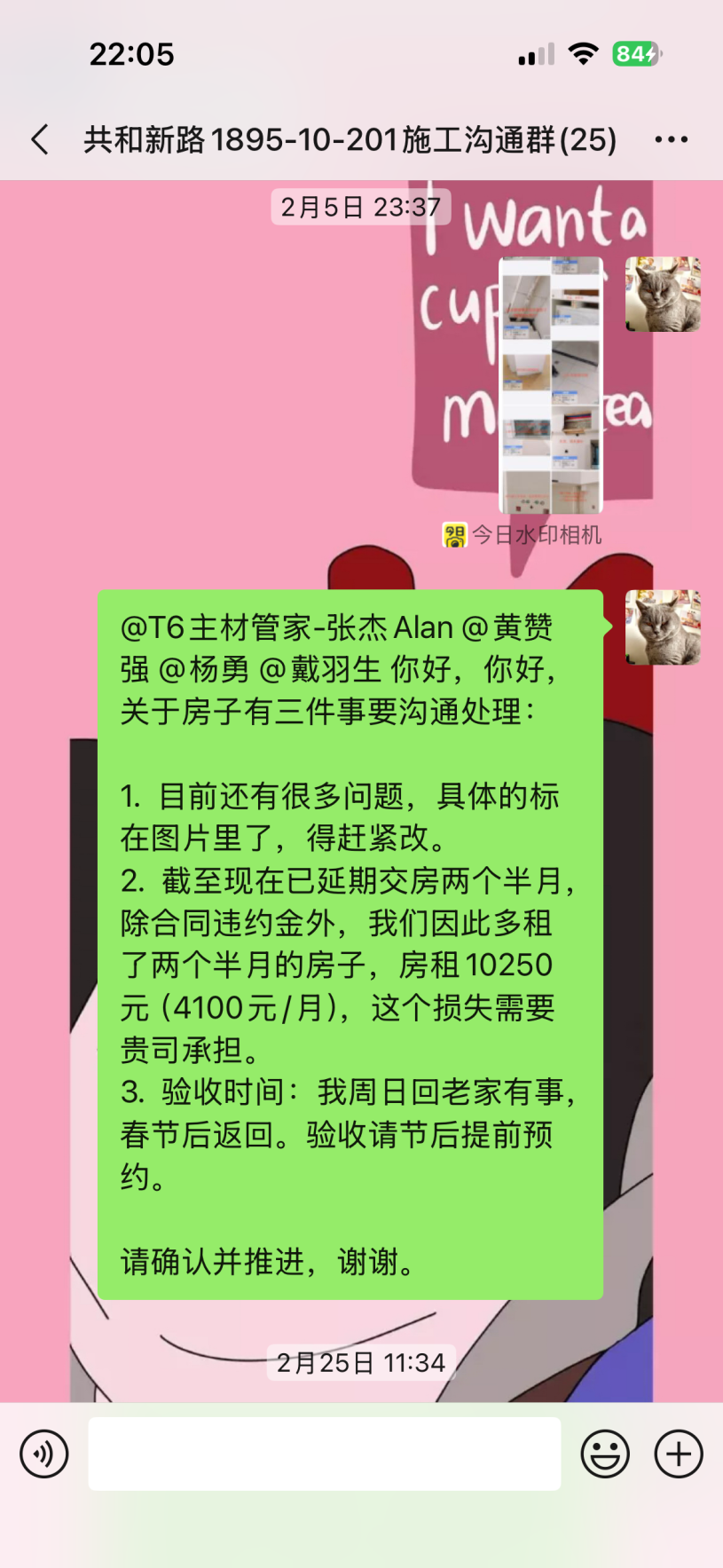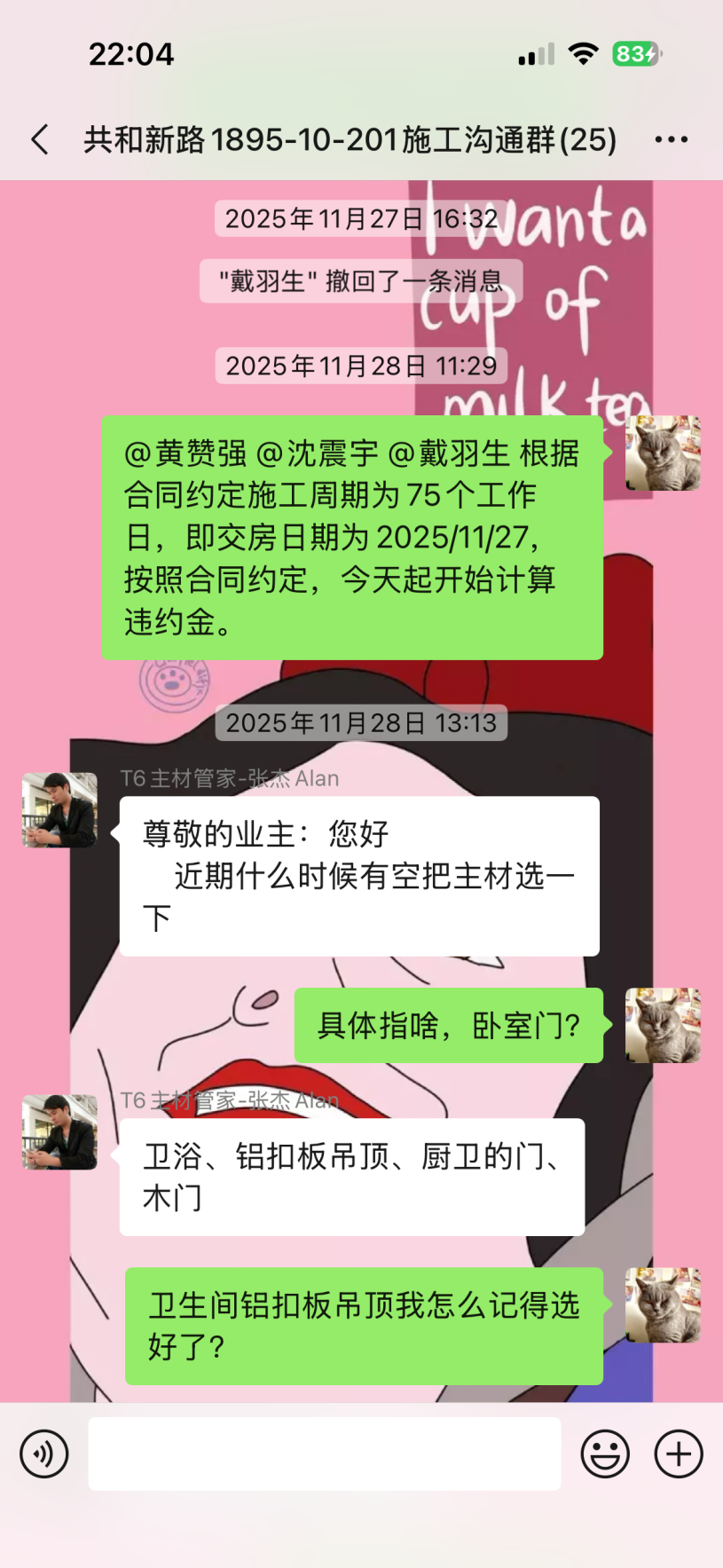 截至目前仍未完工,主材備貨也未按合同執(zhí)行,已嚴重逾期。本人多次發(fā)催告函、在工作群溝通,對方拒不聯(lián)系、拒不協(xié)商,持續(xù)消極違約。同時施工過程中,該公司違規(guī)操作將樓上樓板打穿,雖已修復(fù),但過程中推諉責(zé)任,且修復(fù)時間嚴重逾期。