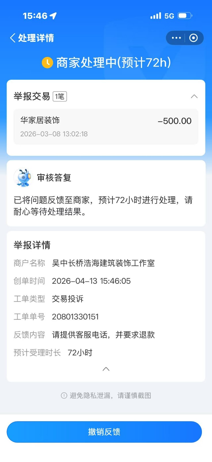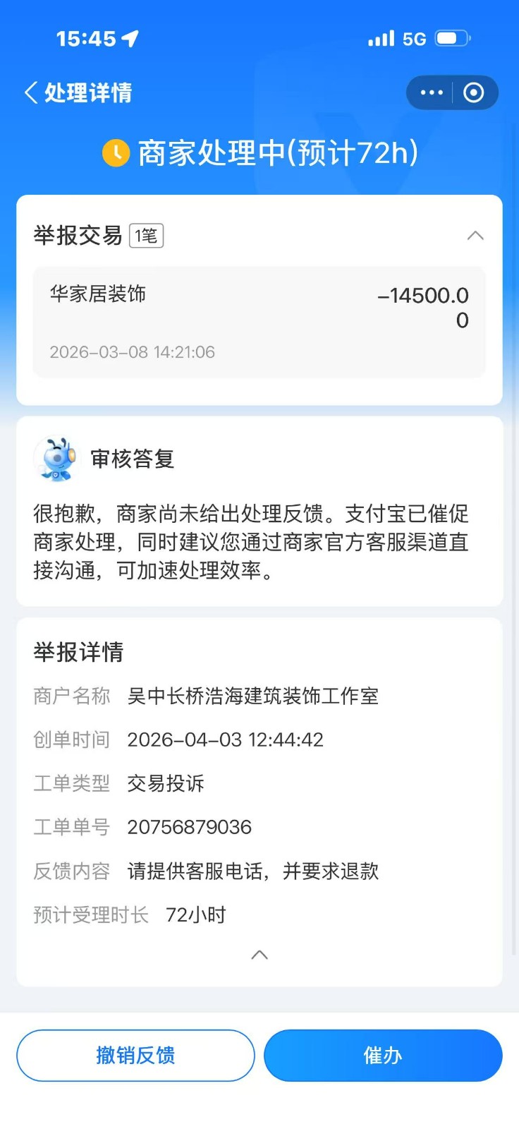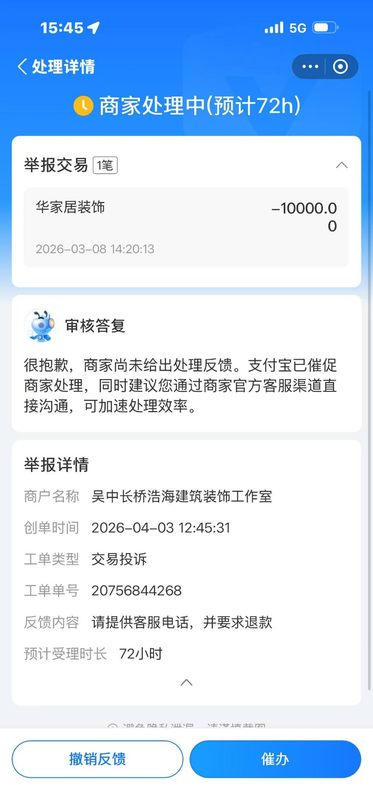 | 裝修面積 | 144m2 | 投訴人手機(jī) | 1304164**** | 被投訴人手機(jī) | 1996212**** |