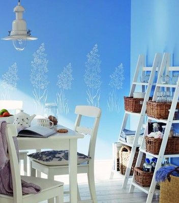 餐廳的墻面背景墻,手繪白色的植物做為裝飾,陽光從窗戶里泄進(jìn)來,這個(gè)采光非常好的餐廳。稱以柔和藍(lán)色的墻面漆,雖然裝飾品沒有,但是陽光、植物就是最好的裝飾品了