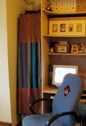 現(xiàn)在上面那張的左邊空隙,我在淘寶上定做了一個(gè)架子,結(jié)果對(duì)方?jīng)]有嚴(yán)格按照我的尺寸,弄得兩邊都有點(diǎn)縫,也不好看,我很苦惱,想了半天,終于想到用一個(gè)自己的披肩給外面一搭呵呵居然不覺得難看,藏了好多亂七八糟的東西哦。