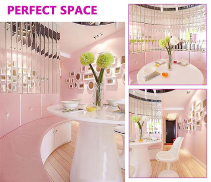 粉色的餐廳,它的設(shè)計(jì)同廚房相結(jié)合。以節(jié)省空間,餐椅制作為固定的一排,亦可作為收納空間,可以很實(shí)用,又會(huì)很美觀(guān)。