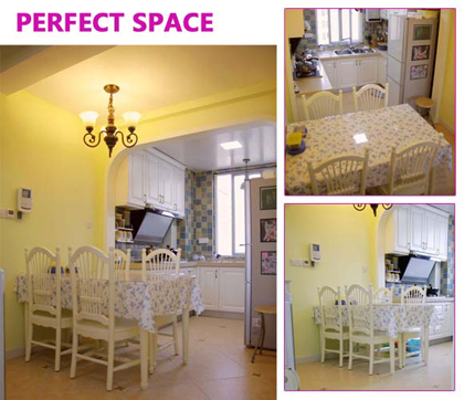 餐廳同廚房相連,廚房做成半開放形式,這樣既可以節(jié)省空間,又符合美式田園的設(shè)計風(fēng)格。小小的方形餐桌鋪上淡藍(lán)色的碎花桌墊,給餐廳增添了優(yōu)美寧靜同柔黃色的墻漆相互印。
