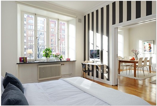 臥室,黑白間條設(shè)計(jì)占據(jù)了半個(gè)房間。白色的電腦桌色釘在墻上的,電腦就像沒有支撐地浮在半空中一樣。陽臺(tái)上的空間可以放書和綠色盆栽,豐富了以黑白為主的房間的色彩。