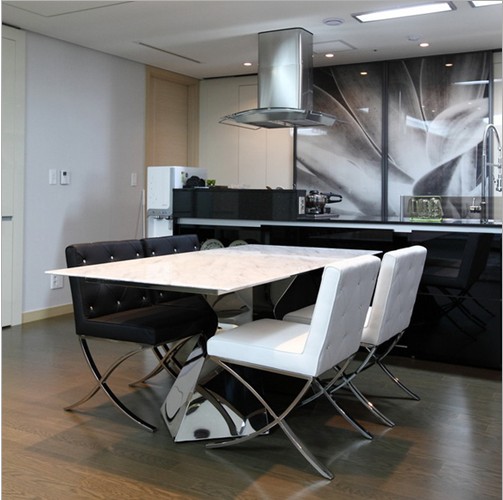 餐廳區(qū)域又是黑白銀的搭配,和家居設計保持連貫性和統(tǒng)一性。用大理石材料的白色飯桌,體現(xiàn)家居的奢華,低調又有格調。以黑白表情呈現(xiàn)開放餐廳的簡約意象,與全屋設計同元素的材質呈現(xiàn)一氣呵成的連貫感受。