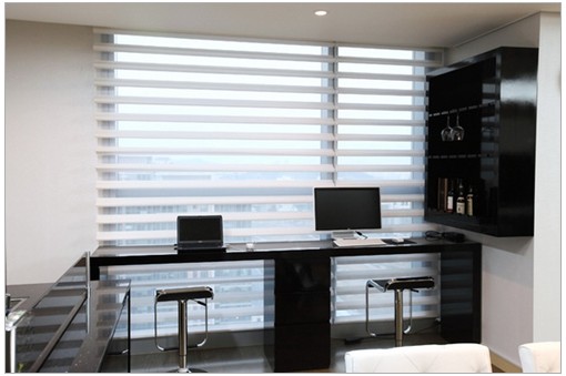 餐廳的另一邊的休閑間,品嘗美酒、玩電腦、從落地玻璃窗欣賞風景,在忙碌的都市生活中忙里偷閑。白色的百葉窗、白色的墻壁、黑色的酒柜,再搭配窗外的風景,明亮透澈的設計,使人心境舒暢。