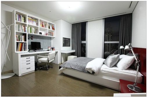 銀色的抱枕、灰色的被套、深灰色的窗簾使寢室和客廳的設計保持連貫性。搭配酒紅色的床頭板,透露出一絲女性的性感特色。臥室內書柜和書桌的二合一,節(jié)省空間,也讓生活更加便利。書柜旁邊的衣帽架,線條設計特別,為空間增添了另外一種的線條層次,同時和床頭的不規(guī)則書柜相互輝映,相互呼應。