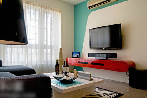 純凈且不失活力的房間基調(diào),酒瓶造型的飾品簡(jiǎn)潔利落,立體感強(qiáng)。電視背景墻上大面積的亮色色塊增添了房間的生機(jī)活力,將快樂(lè)的氣氛傳播開(kāi)來(lái)。留白的墻面被涂刷上了極亮的藍(lán)色邊框,與紅色電視柜強(qiáng)烈的對(duì)比沖撞搭配,似乎隨時(shí)都在迸發(fā)出主人對(duì)生活的**。