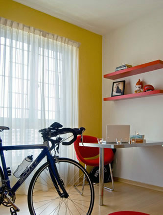 黃色的墻面與鮮亮的紅色座椅搭配,讓整個(gè)工作室顯得精彩十足。加些天真活潑的飾品讓枯燥的時(shí)光變得輕松而富有情趣。輕薄的窗紗讓整個(gè)空間富有靈動(dòng)感。