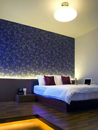 采用蝴蝶圖案的紫色壁紙來(lái)點(diǎn)綴大面積的臥室背景墻,打破了空間純色的單調(diào),擴(kuò)大視覺(jué)范圍而不煩亂;與地臺(tái)下的黃色燈光形成強(qiáng)烈的對(duì)比運(yùn)用,卻有說(shuō)不盡的溫馨感。