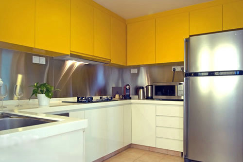 黃色的吊柜具有容易打動(dòng)人的色感,暖色調(diào)的廚房透著一股親和力,帶來(lái)溫馨感覺(jué),而白色的廚柜及金屬貼面的墻壁干凈整潔,為整體空間帶來(lái)寬闊感,讓多彩的熱力在整個(gè)廚房中蔓延開(kāi)來(lái),從此享受起有色的美食生活。
