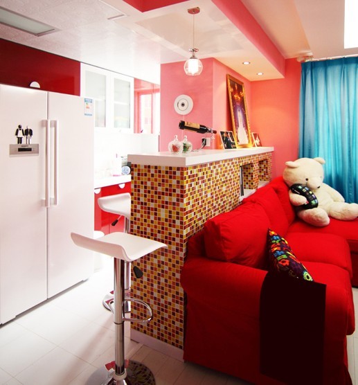 吧臺(tái)。如果只是單調(diào)的紅色就顯得有些呆板,吧臺(tái)設(shè)計(jì)處貼上不規(guī)則馬賽克圖案,星星點(diǎn)點(diǎn)不同的亮色,讓整個(gè)居室看上去有種小清新的感覺。另外則有兩個(gè)白色的吧臺(tái)椅,使空間頓時(shí)顯得比較靈動(dòng)。