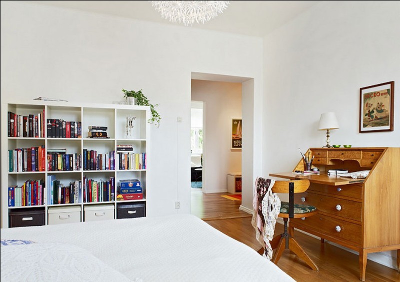 如果說餐廳客廳廚房都是現(xiàn)代感十足的現(xiàn)代歐式風格,那么從臥室的各個細節(jié)又能看出不同。床另一頭的寫字臺旁搭配的椅子,帶有典型的20世紀50年代風格。一點點典雅的風格顯現(xiàn)。