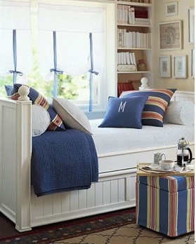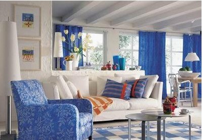 以地中海地區(qū)的地域劃分,地中海風(fēng)格大致有三個(gè)典型的顏色搭配藍(lán)與白:從西班牙、摩洛哥海岸延伸到地中海東岸的希臘,西班牙那蔚藍(lán)海岸與白色沙灘、希臘的白色村莊在碧海藍(lán)天下閃閃發(fā)光,而村莊、沙灘和碧海、藍(lán)天連成一片,一切就像在夢中一樣。就連門框、樓梯扶手、窗戶、椅面、椅腿都會做成藍(lán)與白的配色,加上混著貝殼、細(xì)沙的墻面,小鵝卵石地,拼貼的馬賽克,金、銀、鐵的器皿,都將藍(lán)與白不同程度的對比與組合發(fā)揮到極致。