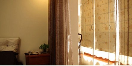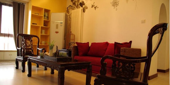 原先有一組傳統(tǒng)家具,一個三人位+兩個單人位實木沙發(fā)椅及茶幾、邊幾。為了更溫馨,也讓人坐進去更舒服和具備休閑感。我們把三人位實木沙發(fā)換成了藤制紅色布藝沙發(fā)。沙發(fā)是網(wǎng)購的,尺寸、藤編紋樣和布料都是精心挑選。當沙發(fā)送到現(xiàn)場當晚我就迫不及待去看,很滿意。沙發(fā)背景墻原先創(chuàng)意是水墨畫的藝術壁布,后來因為造價超預算決定放棄,現(xiàn)在看到的是請一個畫家朋友參照我們選的小樣而現(xiàn)場繪制的丙烯壁畫,沒想到出來的潑墨效果讓人驚嘆!客廳到西陽臺之間有兩扇移門,為了在移門開啟后能夠隱藏起來,特別設計了一組裝飾柜,顏色和飾品體現(xiàn)休閑文化與中國傳統(tǒng)文化的融合。沙發(fā)邊幾上的青瓷臺燈幾乎融入背后壁畫里。茶文化在中國源遠流長,試想在水墨畫中品著茶香的感覺是多么棒!