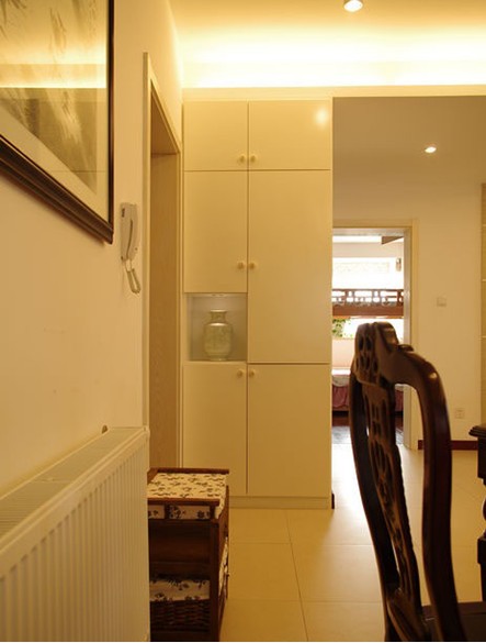 餐桌椅也是裝修前家里就有的,在這里被賦予了新的生命。為了配它,特地選購了后面的水墨畫,畫框是在當?shù)囟ㄖ频?。正好擋住配電箱。進門的玄關柜是白色的。