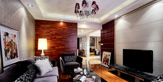 電視背景墻的紫色皮革軟包、沙發(fā)后面的暗紅色木飾面墻涌動一種內(nèi)心的**;黑白相間的靠枕、淡紫色的布衣沙發(fā)、銀色墻紙、抽象的裝飾畫均在白色的天頂下扮演各自的精彩;