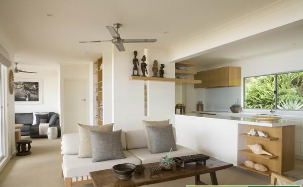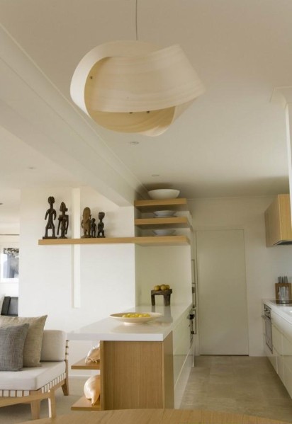 這踏踏米式的沙發(fā),在這個(gè)半開放式的廚房吧臺(tái)旁邊,餐桌在另一角,轉(zhuǎn)角過道都設(shè)計(jì)成了柜子做為收納空間。