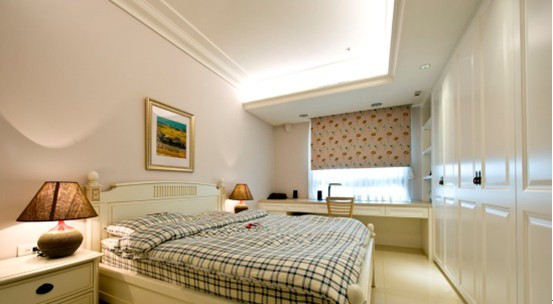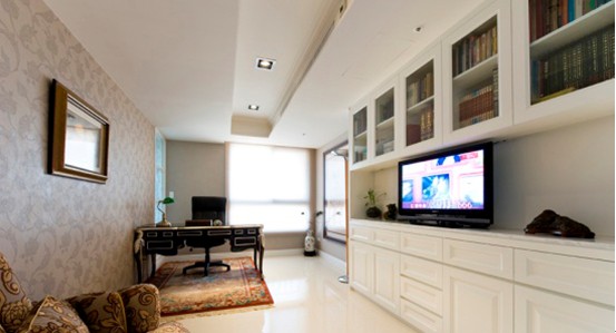歐式中的白色家具是所有裝飾中比較洋氣的,也是比較討巧的裝飾,白色是神圣典雅的;白色大尺寸石膏頂角線條,局部白色吊頂燈帶,具有不對(duì)稱的美感;