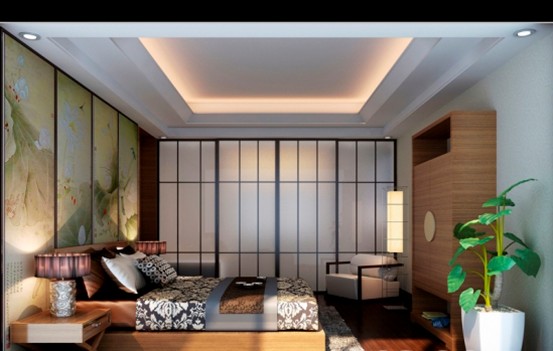 東方元素的水墨國(guó)畫(huà)統(tǒng)攝了室內(nèi)清新婉約的氛圍;磨砂玻璃的移門(mén)有增添了空靈迷蒙的氣芬;中式古典的燈具、床上用品與家具令人感覺(jué)清新脫俗;