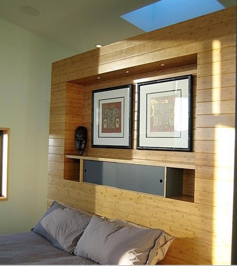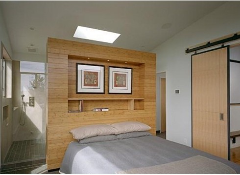 用床頭背景作為隔斷,空間時尚的同時,有十分透氣。原木條紋拼裝的床頭背景墻,多了儲物功能的同時,有簡潔大方,不失品味。