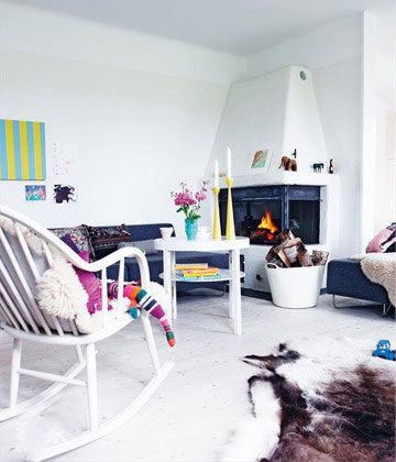 墻面與地地板都選用了白色,搭配的色彩相當?shù)暮啙?,這大范圍的運用了白色,讓人感覺置身于寒冷的北歐,看看這歐洲風格的壁爐給這簡潔的家加分不少,還有毛絨的地毯與椅墊,讓人感覺這家溫暖了許多。