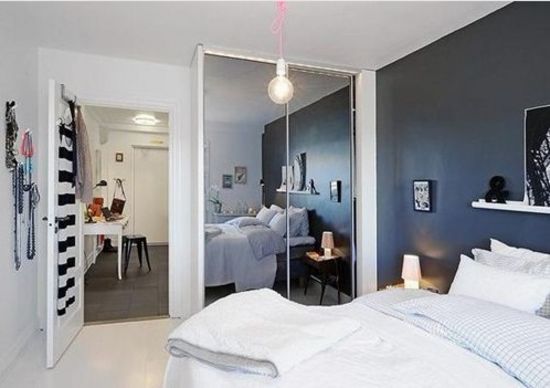 睡房的灰黑色就像海底最深處一般,和明亮的白色搭配一起,清爽自然。鏡面反射的衣櫥讓睡房在視覺(jué)上更加開(kāi)闊。在墻上掛上些“海邊味”的掛飾,把“海邊味”傳染到睡房的每個(gè)角落。