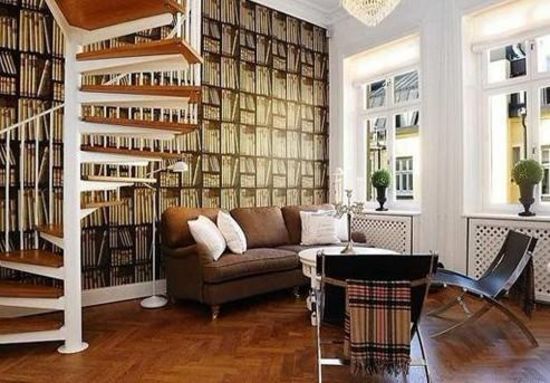 以咖啡色為主基調(diào)的大廳,從壁紙、沙發(fā)到二層樓梯,都以咖啡色為主角,以白色所謂配角,減輕咖啡色給人的暗沉感。值得注意的是,書(shū)柜樣式的壁紙,增加室內(nèi)咖啡色的層次感和立體感,給人以多重的視覺(jué)沖擊。