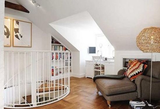 以白色和咖啡色一半一半的比例,讓人登上二層時(shí)有比一層更加寬敞明亮的感覺(jué)。利用不規(guī)則屋頂,加大采光的角度,搭配白色墻壁的反射,室內(nèi)光線更加明亮。鳥(niǎo)巢狀的燈罩和咖啡色的沙發(fā)搭配在一起,讓一層和二層的設(shè)計(jì)有所聯(lián)系,這樣整體家居的設(shè)計(jì)主題才能夠統(tǒng)一。同時(shí)二層開(kāi)始加入紅色的裝修,為下一步的紅色主題做鋪墊。