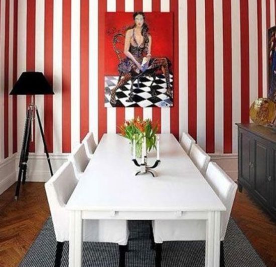 到了以熱情如火的紅色為主題的空間—飯廳了。紅白相間的壁紙,表達(dá)紅色的熱情之余,用白色的冷靜來(lái)平衡調(diào)和,減低紅色給人的壓迫感,同時(shí)也是另一個(gè)白色空間的過(guò)渡。值得注意的第一點(diǎn),是壁畫(huà)的選擇,壁畫(huà)上的黑白地板瓷磚是不是很熟悉呢?