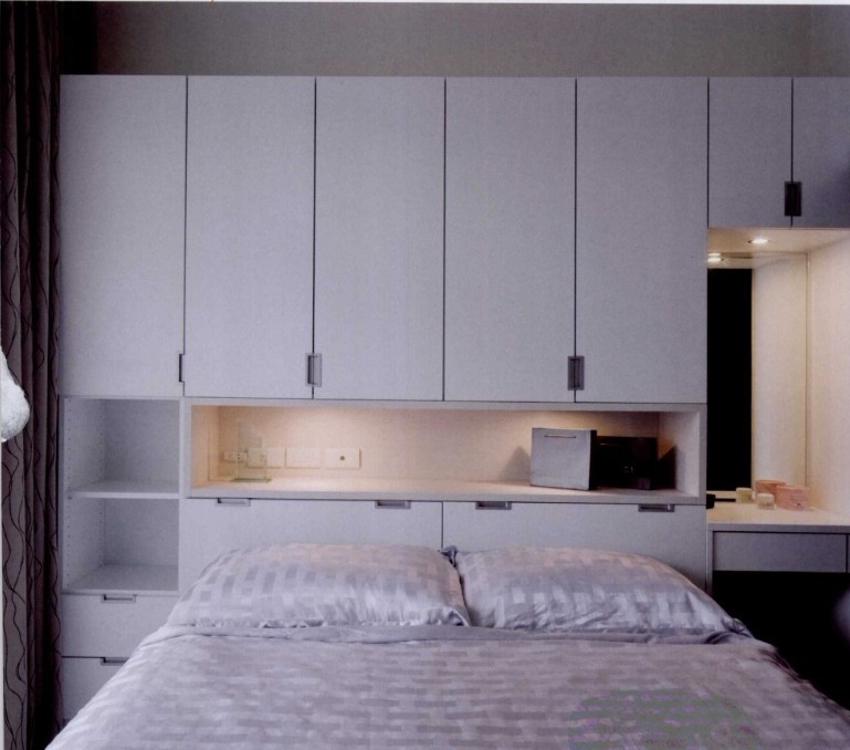 主臥空間有限,設(shè)計師利用床頭空間規(guī)劃床頭柜,并全都采用系統(tǒng)柜,左邊為展示型的收納柜,右邊是梳妝臺。特別選用霧面白色木紋門片,提升空間質(zhì)感。