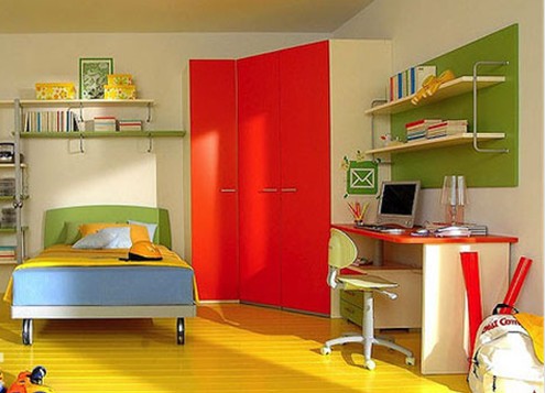 強(qiáng)光照射在明黃色的地面上顯得非常溫馨,這樣的兒童房設(shè)計(jì)就算沒(méi)有陽(yáng)光的照射,也抵擋不了散發(fā)出的溫馨味道。房間顏色較多,且多用撞色搭配設(shè)計(jì),很大膽的色調(diào)選取,紅與黃自然是最好的搭配。少許綠色的點(diǎn)綴,房間也愈加顯得明朗活躍。