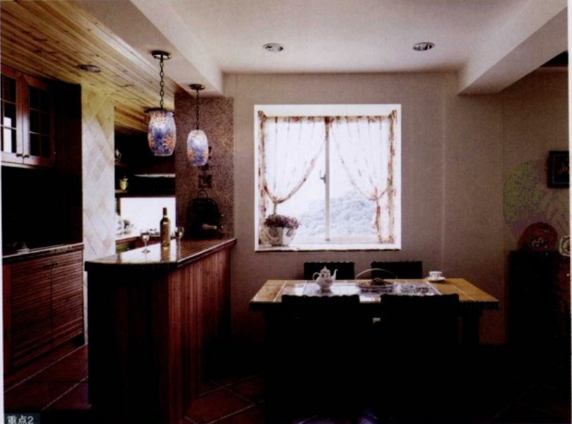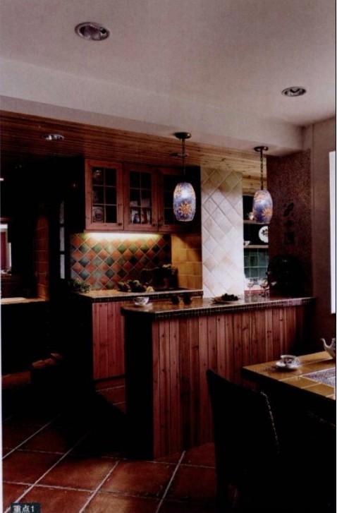 設(shè)計師以開放式的手法,引進(jìn)良好光線以及利用顏色搭配,打造環(huán)境優(yōu)美的居家。在公共空間,廚房、餐廳到客廳采用開放式設(shè)計,餐廳與廚房利用中島臺面作為分隔點,中島臺面的設(shè)計刻意調(diào)和了松木原色與粉紅色,營造出溫馨的氛圍。廚房的空間外推,將工作區(qū)域隱藏起來,而馬賽克磚、西班牙進(jìn)口陶磚的使用,都帶來極佳的裝飾效果,滿足女主人對于廚房的夢想。