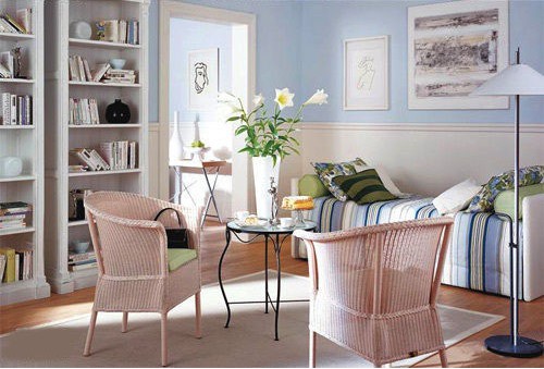 軟裝搭配:天藍(lán)色墻漆+淺色藤椅+軟裝飾