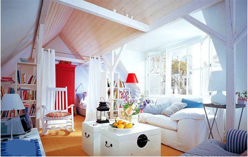 閣樓形式的客廳空間設(shè)計(jì),到處用到了木條式結(jié)構(gòu)裝飾。客廳別致的木箱茶幾,藍(lán)白色條紋沙發(fā)坐墊,藍(lán)與白的色彩搭配描繪出一片藍(lán)色的海洋,喜歡大海的人,一定會(huì)喜歡這樣的空間,置身其中像微風(fēng)拂過(guò),享受著室內(nèi)的恬靜與優(yōu)雅。