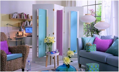 軟裝搭配:白色地板+圓點(diǎn)收納盒+三色屏風(fēng)