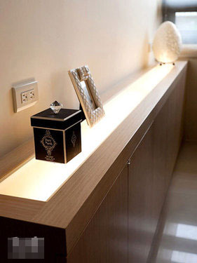 收納柜上方臺(tái)面作間接光源透光處理,柜體以收納為主。