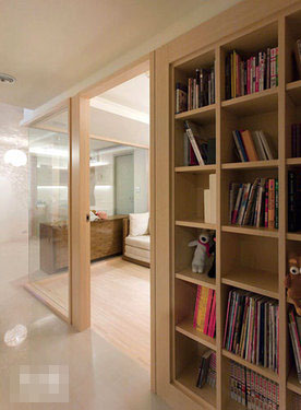 書房界面以清玻璃與公共空間作界定,敞朗而明亮,書柜以嵌入方式與接口切齊規(guī)劃,維系立面的完整同時(shí)收納機(jī)能充裕。