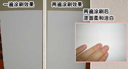 過半個小時左右,測評員仔細查看,現(xiàn)場比對,發(fā)現(xiàn)涂刷一次的效果也不錯,除了石膏板面上的小突起外基本上將石膏板完全覆蓋,漆面也比較有光澤,不過明顯感覺漆膜比較?。辉賹Ρ韧克纱蔚氖喟?,看起來富有光澤,漆面柔和潔白。不過在實際的施工過程中,第一遍要表干2小時,4-6小時后涂刷第2遍,這樣效果會更好。