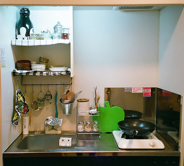 MM說,一個(gè)住的房子,不要空間太大,會(huì)覺得空曠,沒有安全感。小房子,都自己的手塞得滿滿的,反而更舒適。這個(gè)小廚房剛過1米5,卻是實(shí)用之極,油、鹽、醬、醋的瓶瓶罐罐擺放在各自應(yīng)有的架子上,小廚具的擺放利用墻面的空間立掛在水池對(duì)面的墻上,在上面的則是定制的小木柜,可以存放碗具。為了防止白凈的墻面有油煙污染,特地在爐子邊的墻壁上置上這樣的不銹鋼面板,易清潔。