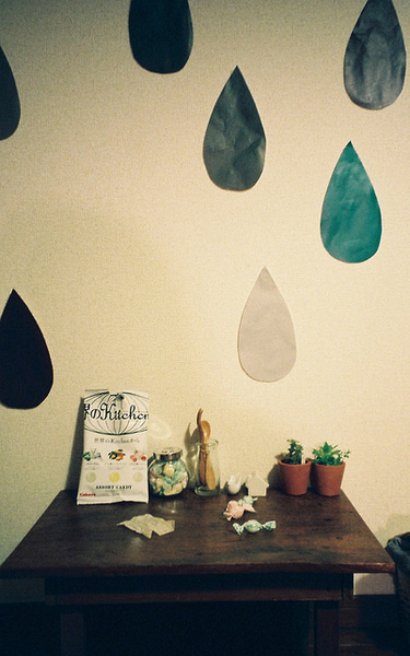 這個(gè)稍顯零亂的臥室正是MM的臥室,真正的席地式生活、赤腳、坐在薄薄的小軟墊上寫作業(yè)瀏覽網(wǎng)頁都是她一直以來的生活習(xí)慣。簡約的居家裝飾,沒有多余的家具,墻面上出現(xiàn)的水滴裝飾還是MM自己隨手剪的彩紙而已。