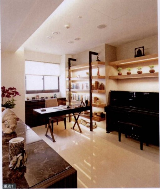在競爭越來越激烈的今天,小孩子的教育已經(jīng)不僅是從娃娃抓起了。本案的業(yè)主非常重視小孩的教育,并不希望客廳像傳統(tǒng)那樣一定要有電視柜,因為電視在他們的生活中并不重要,反而是書房及琴室對于他們來說才是重點的空間。于是設計師便將書房的隔斷拆除,變成開放式的書房,省去電視柜,以半身柜連接客廳與書房,維持空間的開闊感。書房連同琴室一同規(guī)劃,并將書桌與鋼琴一并考慮,設計師以淺色開放書架及書桌、展示層板,結全屋主種植的小盆栽,打造人文感十足的空間。