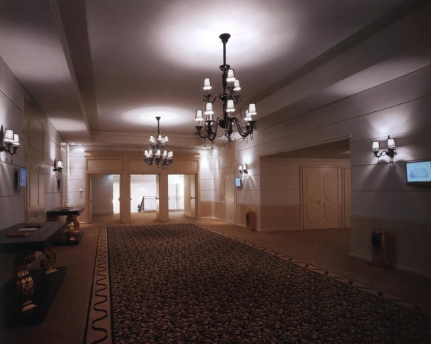 這是一個公共空間室內(nèi)走廊的設計,以地毯的鋪設作為軟裝飾元素,用暗色的細碎的花紋圖案來渲染出空間莊重、深沉的氣息,使人能夠從心底產(chǎn)生出一種嚴肅的情緒。