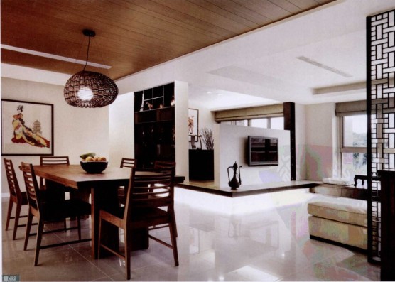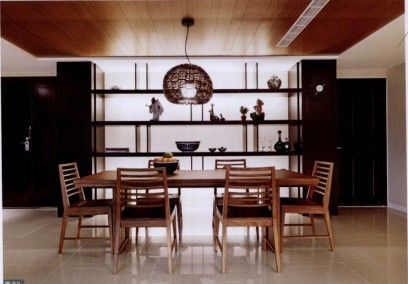 餐廳上方是不規(guī)則侵害的實(shí)木天花板,線條簡(jiǎn)潔的深色展示柜,主角刻意留給柜子上各個(gè)不同形狀、材質(zhì)的藝術(shù)品,低調(diào)的柜子讓中國味十足的各種瓷器、杯盤高調(diào)地展示。