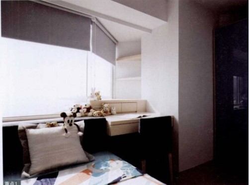 臥室由結(jié)構(gòu)產(chǎn)生了畸零空間,設(shè)計(jì)師因此在窗前設(shè)計(jì)書桌,再利用階梯的概念將收納柜體向上延伸,將空間難題完美地解決。