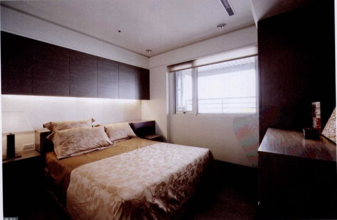 臥室的床頭上方有壓梁的問題,設(shè)計(jì)師在此配置了吊柜,將梁柱隱藏起來,吊柜下方安裝燈光,減輕柜體的重量感,讓臥室更加舒適。