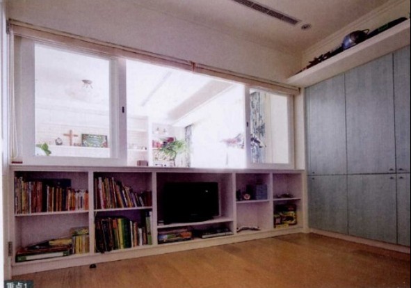 男孩房與客廳間用玻璃隔開,考慮到取放玩具及書籍的方便,在玻璃隔斷下方設(shè)計了開放式的柜體。讓他從小培養(yǎng)自己的生活習慣。
