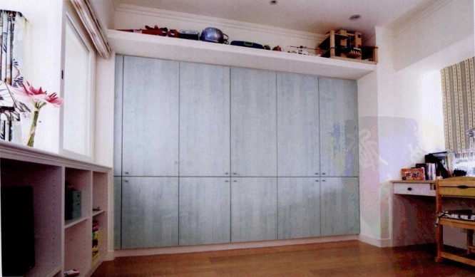 每個房子可能或多或少都會出現(xiàn)畸零空間,應(yīng)該多利用這些空間的使用。男孩房的柜體止方有梁柱,因此設(shè)計有層板,一來滿足收納功能,二來則可以遮蔽梁柱。